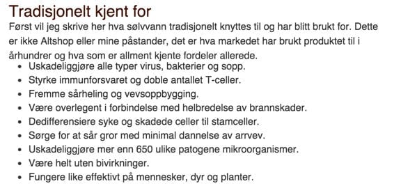 Norsk Helseinformatikk har en artikkel om sølvvann, og her kan vi lese: