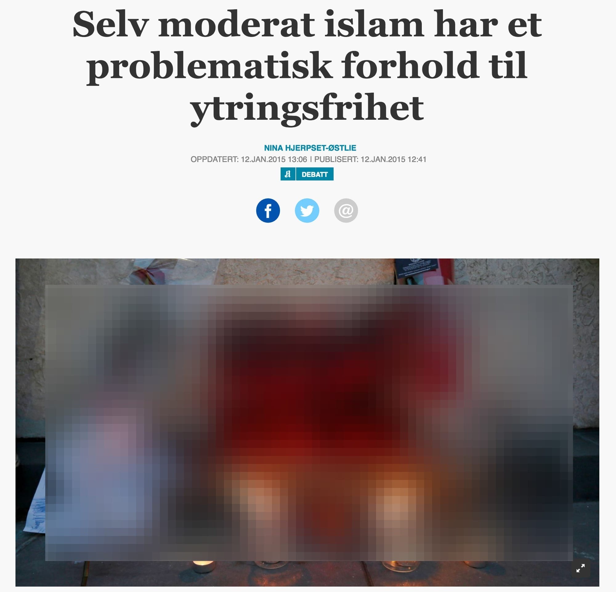 Premisset synes nemlig å være at islam har et stort problem med ytringsfrihet. Islam er derfor en fare for vårt sekulære samfunn som er bygget på pillarer om den uinnskrenkede rett til å ytre seg, noe nordmenn flest er enige i. Norske nordmenn fra Norge, eller vestlig befolkning for øvrig, enten det er europeere eller amerikanere, ønsker stort sett full ytringsfrihet. Vi er ikke begrenset av den religiøse tvang slik som disse muslimene er, og det må vi våge å diskutere. Vi er ikke så hårsåre, og tåler at vår tro og våre meninger utfordres i den offentlige debatt.