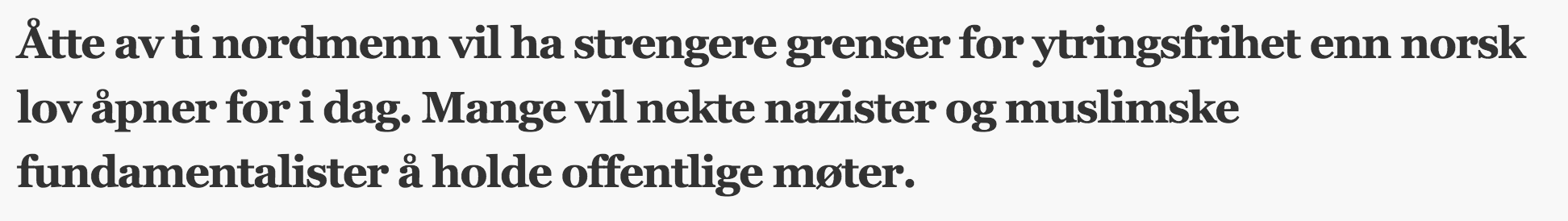 Det kan da være nyttig å minne på at andel av den norske befolkning som er muslimer ligger et sted mellom to og fire prosent. Når 80 prosent av de spurte ønsker å begrense folks rett til å krenke gjennom ytringer, er ikke dette først og fremst et «muslimproblem». Det er et samfunnsproblem.