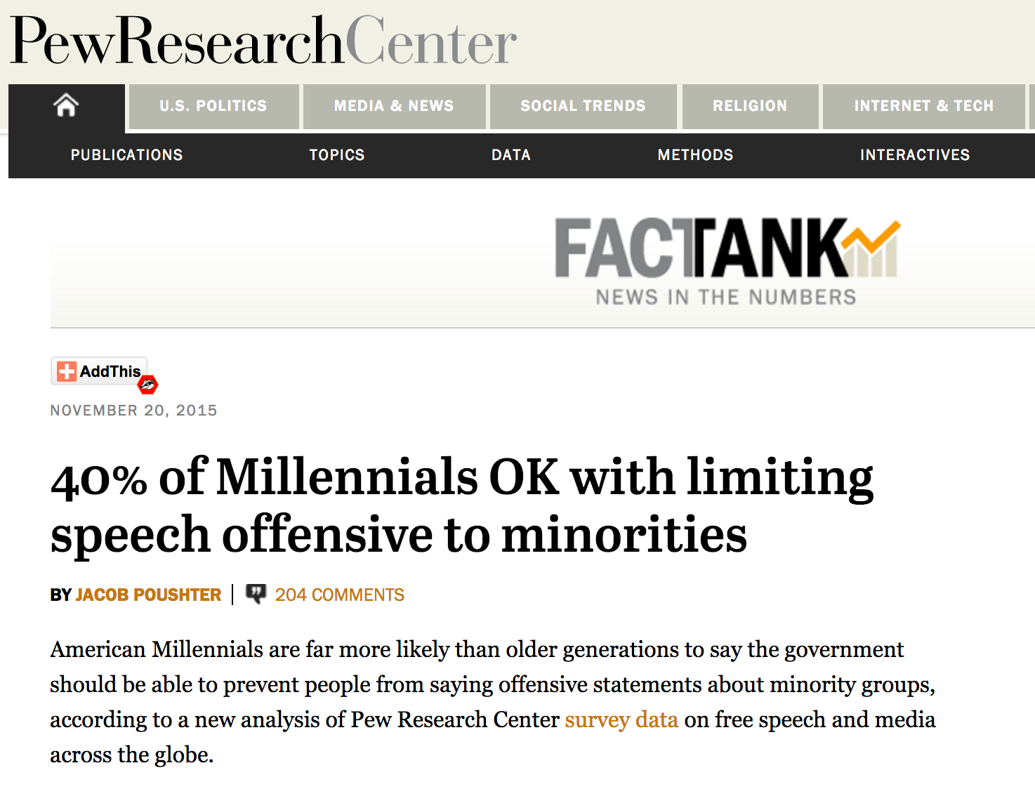 I USA viste en undersøkelse utført av PEW Research Center i 2015 at hele fire av ti unge i alderen 18 til 34 år mente myndighetene burde kunne forby ytringer som kan oppleves som krenkende av minoriteter. Av alle amerikanere, uansett alder, mente 28 prosent det samme.