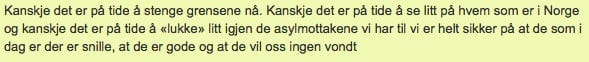 Den er derimot et kall til alle om å reflektere over konsekvensene av våre valg. Den er skrevet i håp om å gi et perspektiv som er helt sentralt for å i det hele tatt kunne diskutere innvandringsspørsmålet på en etisk forsvarlig måte. Den eneste pekefinger jeg retter, er mot meg selv og oss alle.